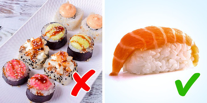 Sushi: Bản thân sushi không có hại, nhưng các thành phần có chứa chất phụ gia đi kèm với sushi lại là vấn đề chính gây hại cho con người. Ngày nay, để tạo hương vị cho món ăn, nhiều cửa hàng thêm mayonnaise, phô mai kem hay nước sốt. Kiểu thêm hương vị này khiến sushi chứa rất nhiều calo, ăn nhiều sẽ khiến bạn gặp vấn đề về cân nặng, béo phì …