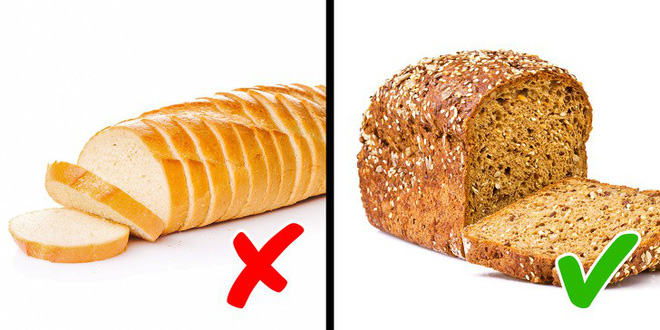 Bánh mỳ trắng: Bánh mỳ trắng được làm từ ngũ cốc đã qua tinh chế nên thiếu rất nhiều chất dinh dưỡng và chất xơ cần thiết cho cơ thể. Trong khi chất xơ lại có vai trò quan trọng trong phòng chống một số bệnh liên quan tới tim mạch và huyết áp. Do vậy, thay vì ăn nhiều bánh mỳ trắng, bạn nên chọn bánh mỳ được làm từ ngũ cốc nguyên hạt.