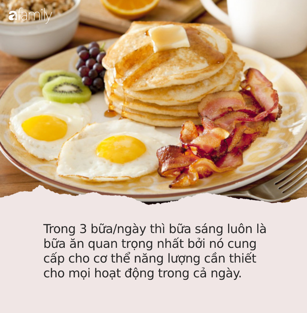 Trong 3 bữa/ngày thì bữa sáng luôn là bữa ăn quan trọng nhất bởi nó cung cấp cho cơ thể năng lượng cần thiết cho mọi hoạt động trong cả ngày. Đại học Tim mạch Mỹ từng thực hiện một nghiên cứu, cho thấy những người bỏ bữa sáng có nguy cơ tử vong vì bệnh tim mạch cao hơn 87% và tăng 19% nguy cơ tử vong do mọi nguyên nhân.