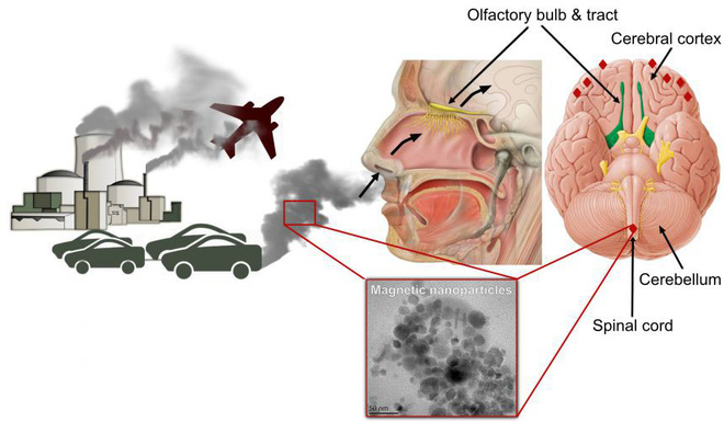 Nghiên cứu mới của các nhà khoa học Anh cho thấy, các hạt phân tử được tìm thấy trong tình trạng ô nhiễm có thể xâm nhập não người do hít thở không khí. Các phân tử ô nhiễm là magnetite (oxit sắt từ) có kích thước nhỏ hơn 150 nanometer được phát hiện bên trong vỏ não trước. GS. Barbara Maher tại Đại học Lancaster chủ trì nghiên cứu cho biết, magnetite là chất độc đối với não người.