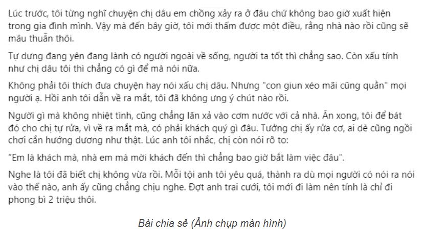 Nghe là tôi đã biết chị không vừa rồi. Mỗi tội anh tôi yêu quá, thành ra dù mọi người có nói ra nói vào thế nào, anh ấy cũng chẳng chịu nghe. Đợt anh trai cưới, tôi mới đi làm nên tính là chỉ đi phong bì 2 triệu thôi.