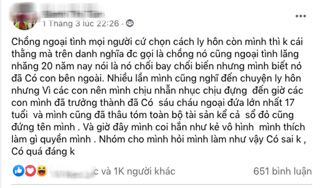 Cô vợ viết: "Chồng ngoại tình mọi người cứ chọn cách ly hôn, còn mình thì không. Cái thằng mà trên danh nghĩa được gọi là chồng nó cũng ngoại tình lăng nhăng 20 năm nay, nói là nó chối bay chối biến nhưng mình biết nó đã có con bên ngoài.