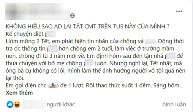 "Nói là xin thông tin, chứ thật ra em đã nắm cả trong lòng bàn tay, chỉ lấy cớ để đăng bài phốt thế thôi. Hàng xóm nhà tiểu tam thi nhau vào bình luận, hỏi như hội, còn nhắn tin riêng nữa. Em nhẹ nhàng gửi loạt chứng cứ cho hàng xóm. Việc tiến hành thế nào, em đều đã cân nhắc cả. Em không muốn níu kéo chồng nữa.