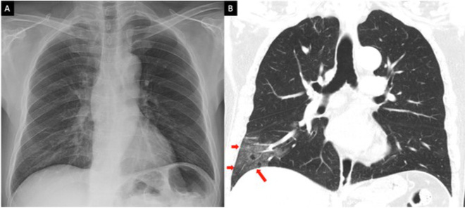 Với những bệnh nhân bị áp xe phổi là tình trạng mưng mủ của nhu mô phổi bị viêm. Nguyên nhân do vi khuẩn gây mủ ưa khí hoặc kỵ khí, X-quang sẽ thấy mờ ở phổi hoặc nhiều ổ áp xe. Tới giai đoạn thoát mủ có thể thấy hình hang với mực nước ngang các ổ áp xe.