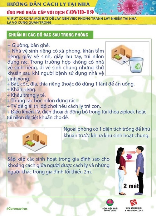 Dưới đây là bộ infographic được phối hợp thực hiện bởi Bệnh viện Phổi trung ương và Viện Nghiên cứu y khoa Woolcock hướng dẫn về việc cách ly tại nhà để phòng lây lan dịch Covid-19.