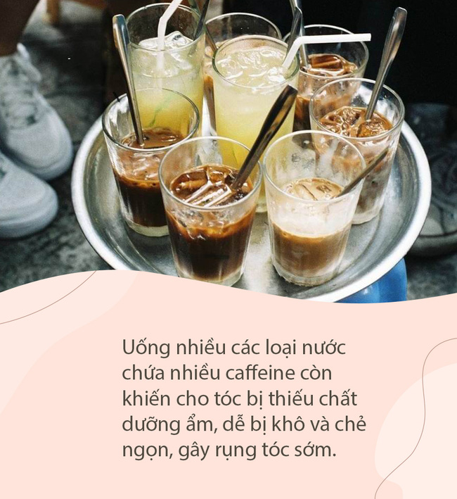 Cà phê hay bia rượu thường chứa nhiều caffeine có tác dụng lợi tiểu. Nếu lạm dụng uống quá nhiều sẽ gây mất nước, mất muối khoáng trong cơ thể và các tế bào. Lâu dài dẫn đến tình trạng khô da đầu, ảnh hưởng nghiêm trọng đến việc nuôi dưỡng và sự phát triển của tóc.