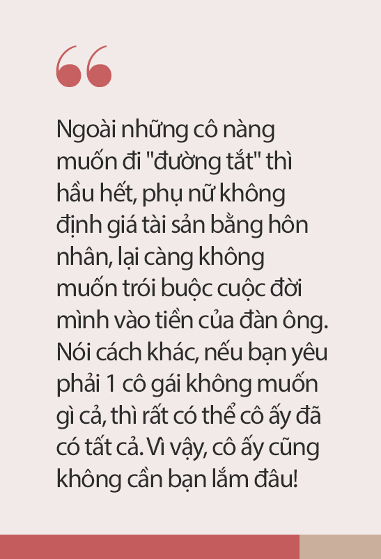 Ngoài những cô nàng muốn đi "đường tắt" thì hầu hết, phụ nữ không định giá tài sản bằng hôn nhân, lại càng không muốn trói buộc cuộc đời mình vào tiền của đàn ông.