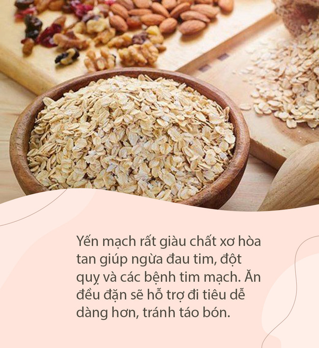 Được ưu ái gọi bằng cái tên "nữ hoàng của các loại ngũ cốc", yến mạch rất giàu chất xơ hòa tan giúp ngừa đau tim, đột quỵ và các bệnh tim mạch. Ngoài ra, beta-glucan trong yến mạch còn có thể làm giảm nguy cơ mắc bệnh mạch vành. Ăn loại thực phẩm này đều đặn sẽ hỗ trợ đi tiêu dễ dàng hơn, tránh táo bón.