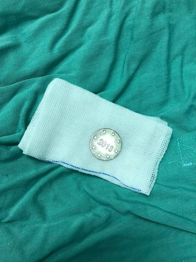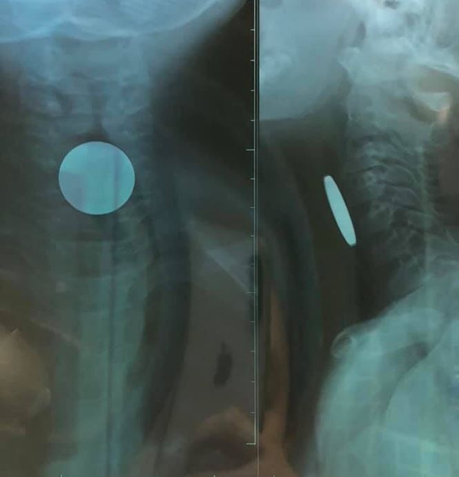 Qua thăm khám và chụp X-quang, các bác sỹ phát hiện có dị vật (đồng xu) đoạn thực quản cổ có đường kính 24mm. Sau khi tiến hành nội soi dưới gây mê và gắp đồng xu ra, bệnh nhi P. đã ổn định và có thể xuất viện.