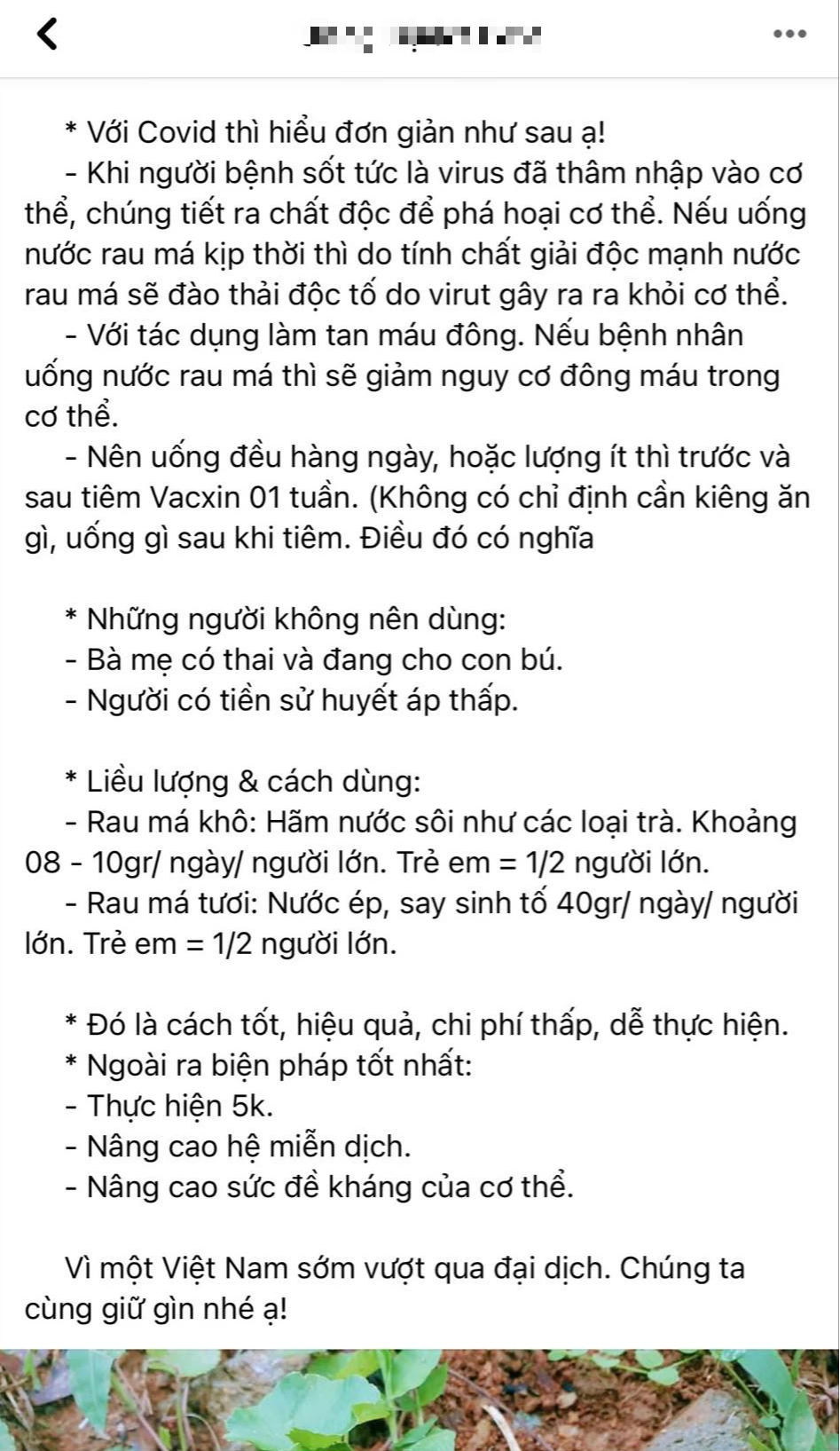 Mới đây, trên mạng lại tiếp tục xôn xao về thông tin về một thứ rau được cho là "có công dụng phòng và điều trị COVID-19" được một chủ tài khoản Facebook chia sẻ - đó là rau má. Theo người viết phân tích: "Khi người bệnh sốt tức là virus đã thâm nhập vào cơ thể, chúng tiết ra chất độc để phá hoại cơ thể. Nếu uống nước rau má kịp thời thì do tính chất giải độc mạnh, nước rau má sẽ đào thải độc tố của virus ra khỏi cơ thể. Nếu bệnh nhân uống nước rau má thì sẽ giảm nguy cơ đông máu trong cơ thể".