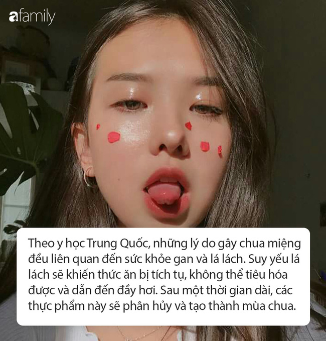 Theo y học Trung Quốc, những lý do gây chua miệng đều có liên quan đến sức khỏe gan và lá lách. Suy yếu lá lách sẽ khiến thức ăn bị tích tụ, không thể tiêu hóa được và dẫn đến đầy hơi. Sau một thời gian dài, các thực phẩm này sẽ phân hủy và tạo thành mùi chua khó chịu ở miệng.