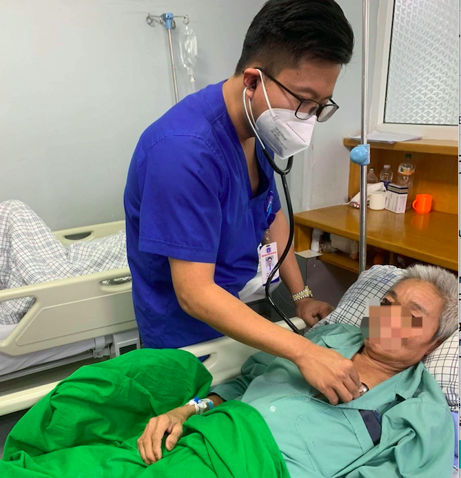 Vào viện, ông Đ. đau bụng, mệt mỏi, buồn nôn không nôn, da, niêm mạc rất nhợt, tim nhịp nhanh; huyết áp xuống rất thấp (70/40mmHg), dấu hiệu phản ứng thành bụng khắp bụng.