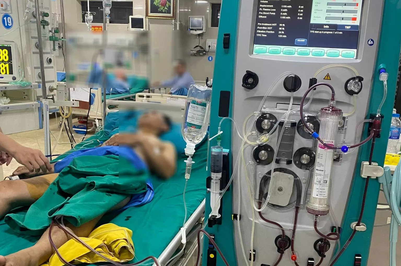 Ngay lập tức, bệnh nhân được chỉ định thay huyết tương cấp cứu trong đêm. Bác sĩ Lương Minh Tuấn, Phó giám đốc Bệnh viện chỉ đạo kíp lọc máu nhanh chóng thiết lập quy trình thay huyết tương và tiến hành kỹ thuật.
