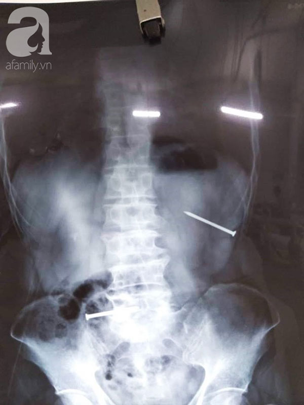 Người đàn ông 57 tuổi, ngụ Dĩ An, Bình Dương nhập khoa Cấp cứu trong tình trạng đau bụng dữ dội, chảy máu thành bụng, choáng. Bệnh nhân có 2 cây đinh đâm xuyên thành bụng, trong đó một chiếc đâm sâu vào lỗ rốn.
