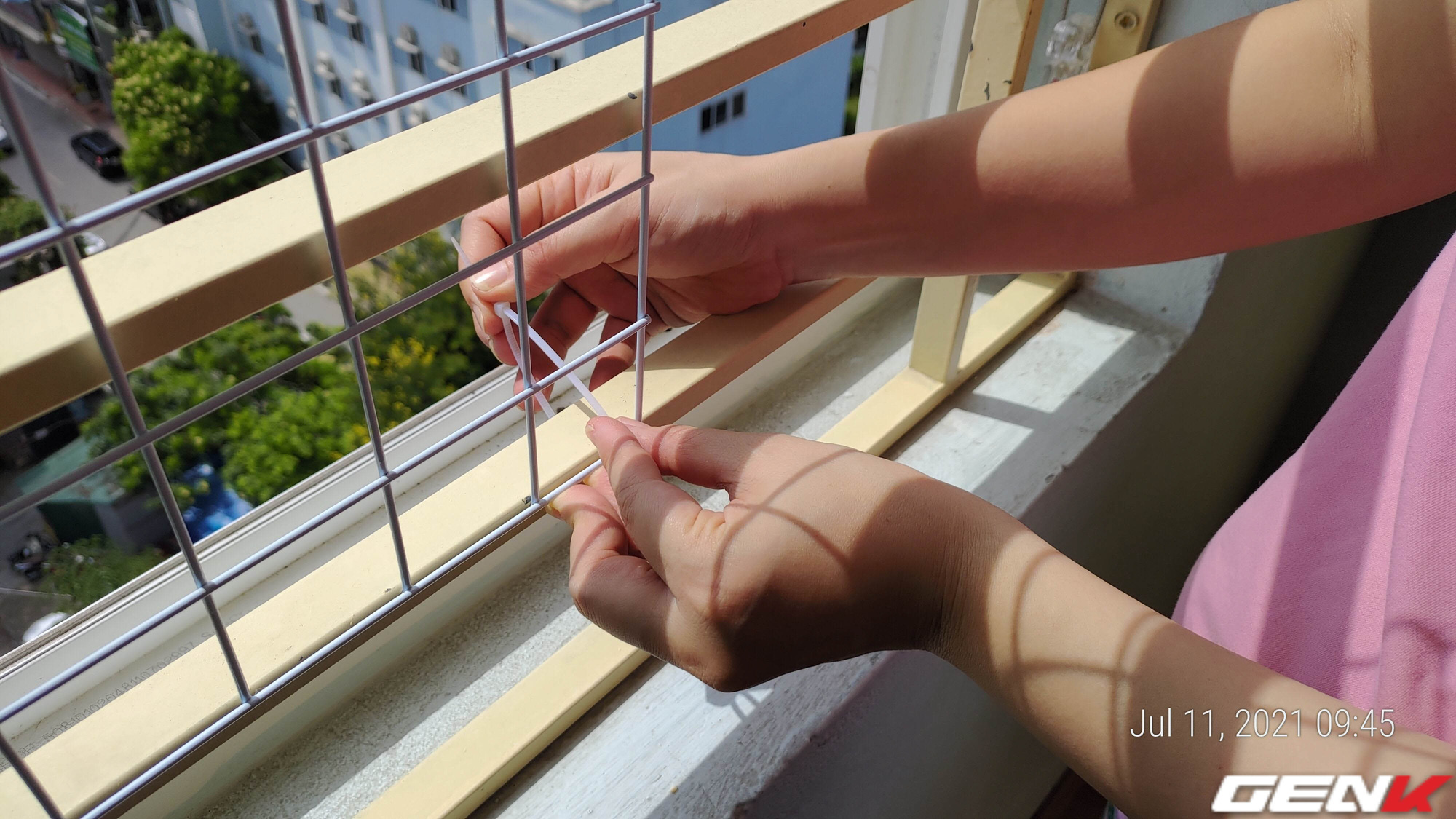 Tiếp tục buộc dây thít cố định một vài điểm cho đến khi tất cả các khoảng hở "có nguy cơ" của cửa sổ đều đã được phủ lưới.