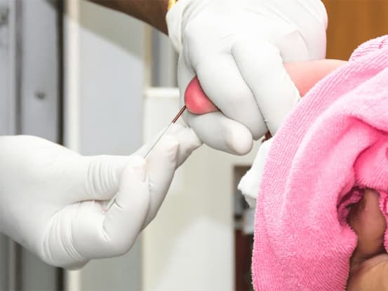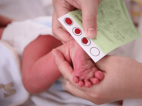Trong vòng 72 giờ sau khi trẻ chào đời, cha mẹ cần phối hợp với y tá để thực hiện lấy mẫu máu gót chân, tức là chọc kim vào gót chân của trẻ, sau đó lấy mẫu máu để kiểm tra. Thao tác này nghe có vẻ đau nhưng thực chất không gây hại nhiều cho bé, hơn nữa nơi thu gom là ở gót chân nên sẽ không gây đau nhiều cho bé.