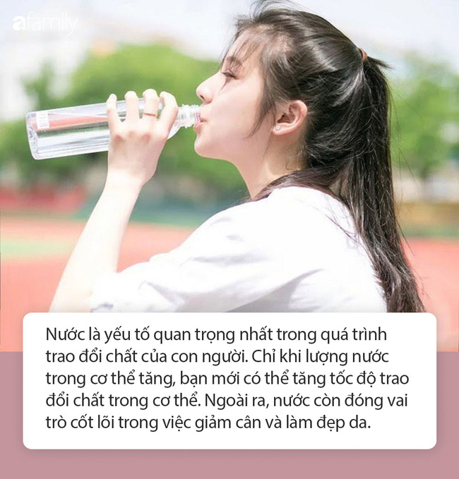 Nước là yếu tố quan trọng nhất trong quá trình trao đổi chất của con người. Chỉ khi lượng nước trong cơ thể tăng, bạn mới có thể tăng tốc độ trao đổi chất trong cơ thể. Ngoài ra, nước còn đóng vai trò cốt lõi trong việc giảm cân và làm đẹp da. Chính vì vậy, hãy cố gắng duy trì uống đủ 2 lít nước mỗi ngày. Nhưng đừng uống liên tục quá nhiều nhé, hãy chia ra uống đều trong ngày mới có hiệu quả.