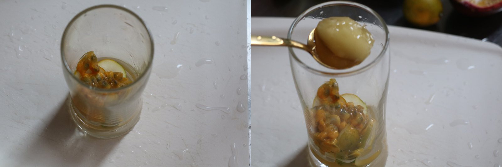 Cho quất vào ly rồi thêm ruột chanh leo vào.