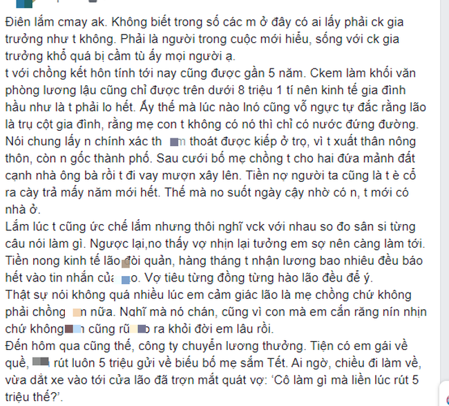 Cô vợ tâm sự: "Điên lắm các chị ạ. Không biết trong số các chị ở đây có ai lấy phải chồng gia trưởng như em không. Phải là người trong cuộc mới hiểu, sống với chồng gia trưởng khổ quá bị cầm tù ấy mọi người ạ.