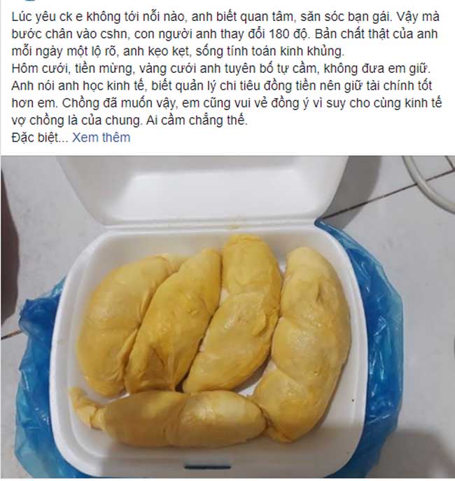 Em chán chẳng buồn đáp lại, dọn nhà xong xách làn đi chợ. Trên đường về gặp hàng sầu riêng ngon quá, em rẽ vào mua 1 quả vừa vừa, vì con em nó cũng thích ăn, dặn mẹ mấy lần. Buổi trưa đi làm về thấy mấy múi sầu riêng em để trên mặt bàn, anh đỏ mặt quát vợ: 'Tiền đâu mà cô đi mua sầu riêng thế này. Cô đúng là ăn đã ăn bám còn tiêu hoang. Thích ăn sang thì tự đi kiếm tiền ấy'.