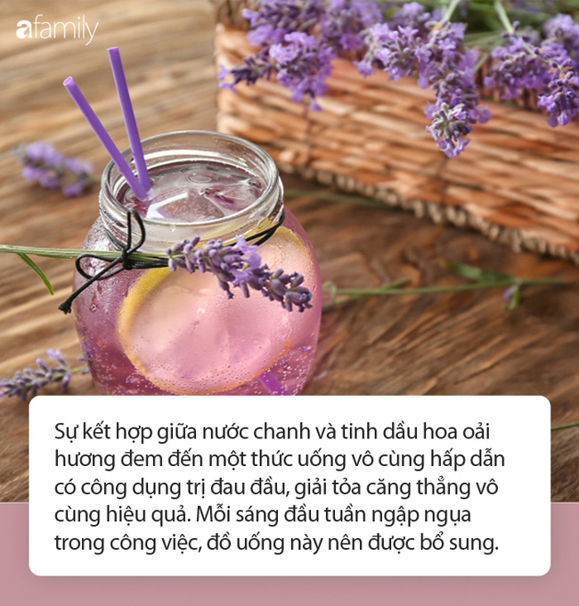 Khi kết hợp tinh dầu oải hương và chanh như hướng dẫn ở trên, bạn sẽ nhanh chóng có được đồ uống giảm đau đầu, đánh bay stress, vô cùng hiệu quả mỗi sáng đầu tuần phải ngập ngụa trong lịch họp cùng những deadline mới căng như dây đàn. Bổ sung thêm mật ong nguyên chất, đồ uống của bạn sẽ thêm phần thơm ngon, hấp dẫn, kích thích vị giác, giúp tỉnh táo và cơ thể tràn đầy năng lượng.