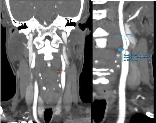 Chưa dừng lại ở đó, hình ảnh MSCT (chụp cắt lớp điện toán đa lát cắt) mạch cảnh xác định mảng xơ vữa mềm gây hẹp tới 86% đoạn gốc động mạch cảnh trong trái, 70% tại vị trí hành cảnh trái, 50% hành cảnh phải và 50% đoạn gốc động mạch cảnh trong phải.
