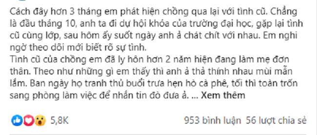 Mới đây, 1 cô vợ lên mạng than thở: "Cách đây hơn 3 tháng em phát hiện chồng qua lại với tình cũ. Chẳng là đầu tháng 10, anh ta đi dự hội khóa của trường đại học, gặp lại tình cũ cùng lớp, sau hôm ấy suốt ngày anh ả chát chít với nhau. Em nghi ngờ theo dõi mới biết rõ sự tình.
