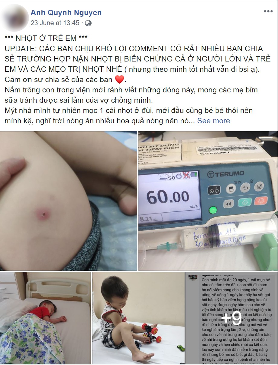 Chị Quỳnh Anh cho hay, rất may là nhọt của bé Khang không nằm ở đầu hoặc vùng mặt nhiều dây thần kinh, lúc sốt cao không bị co giật nên sau khi truyền kháng sinh đã hết sốt và ban độc. Hiện sức khỏe bé đã ổn định và đã được xuất viện.