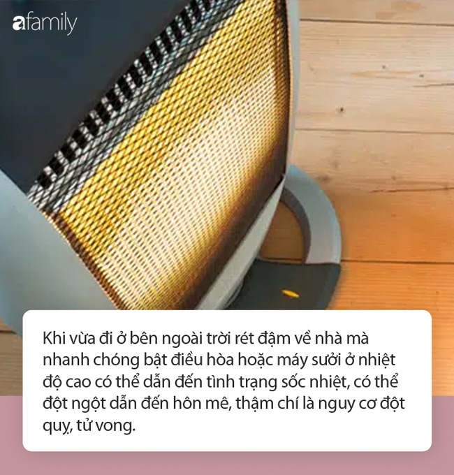 Theo GS.TS Nguyễn Lân Việt (Chủ tịch Hội Tim mạch Việt Nam), khi vừa đi ở bên ngoài trời rét đậm về nhà mà nhanh chóng bật điều hòa hoặc máy sưởi ở nhiệt độ cao có thể dẫn đến tình trạng sốc nhiệt, có thể đột ngột dẫn đến hôn mê, thậm chí là nguy cơ đột quỵ, tử vong. Nguyên nhân bởi, sự chênh lệch nhiệt độ ngoài trời và trong nhà quá lớn có thể khiến cơ thể chưa kịp thích nghi, dễ bị sốc nhiệt.