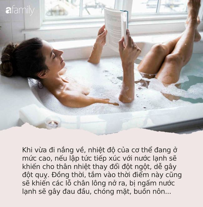 Khi vừa đi nắng về, nhiệt độ của cơ thể đang ở mức cao, nếu lập tức tiếp xúc với nước lạnh sẽ khiến cho thân nhiệt thay đổi đột ngột, dễ gây đột quỵ. Đồng thời, tắm vào thời điểm này cũng sẽ khiến các lỗ chân lông nở ra, bị ngấm nước lạnh sẽ gây đau đầu, chóng mặt, buồn nôn...