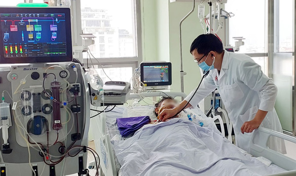 Qua thăm khám, các bác sỹ thấy bệnh nhân hôn mê, thở máy, huyết áp phụ thuộc thuốc vận mạch liều cao, da nổi vân đá toàn thân, không xuất huyết tự nhiên, bụng mềm, gan to 4cm dưới bờ sườn, bờ sắc, mật độ chắc, lách không to, vô niệu.