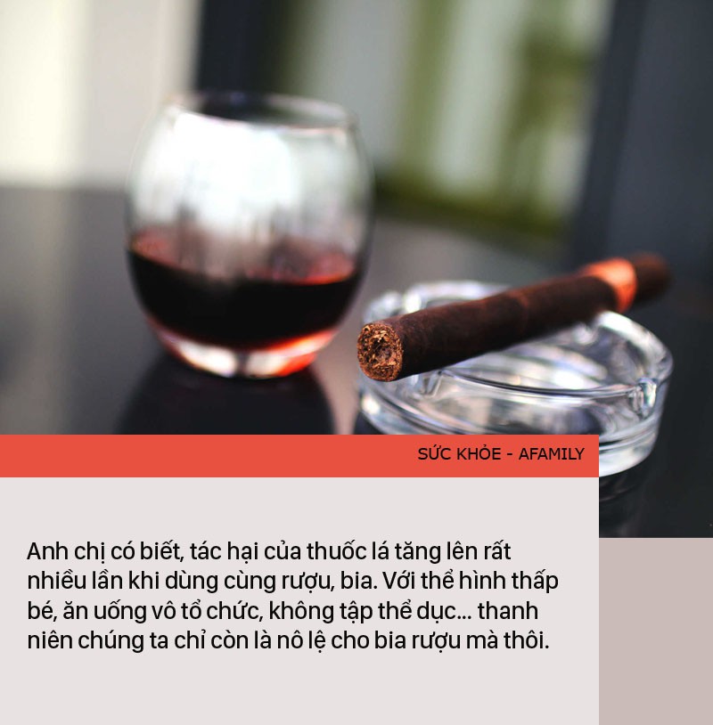 Anh chị có biết, tác hại của thuốc lá tăng lên rất nhiều lần khi dùng cùng rượu, bia. Với thể hình thấp bé, ăn uống vô tổ chức, không tập thể dục… thanh niên chúng ta chỉ còn là nô lệ cho bia rượu mà thôi. Nhiều thanh niên mới 30-35 tuổi nhưng khi gặp bác sĩ không thể nhận ra vì hàm răng vàng do khói thuốc, mái tóc xơ cứng, da nhăn lưng gù cơ nhão, thần thái sức sống không còn…