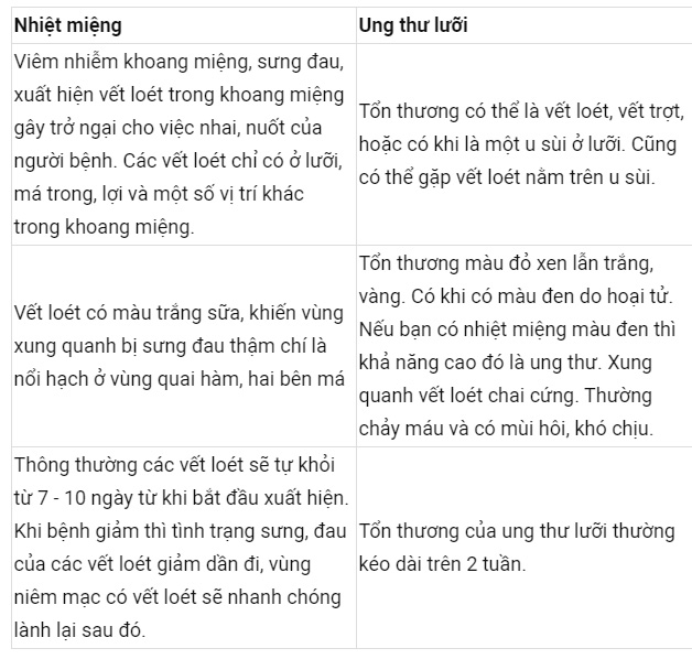 Khác với nhiệt miệng, ung thư lưỡi là một bệnh ác tính. Tổn thương ban đầu có thể là một vết loét ở lưỡi, rất dễ nhầm với nhiệt miệng. Ung thư sẽ lan rộng và di căn tới các cơ quan trong cơ thể. Ung thư lưỡi thường được phát hiện muộn, một phần nguyên nhân do bị nhầm lẫn với nhiệt miệng. Khi được phát hiện thì ung thư đã di căn, người bệnh đã suy kiệt và rất khó điều trị.