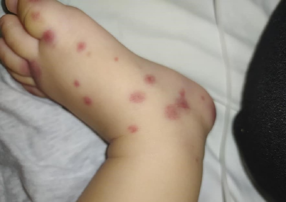 Vài giờ sau khi vào viện, trẻ đột ngột phát ban trên bàn tay, bàn chân kèm theo sưng nề, đau hai bên cẳng chân, cẳng tay và bàn chân. Người thân cho biết, tiền sử trẻ khỏe mạnh, trước đó có sốt một ngày. Cả gia đình xưa nay không có người mắc các bệnh rối loạn đông- chảy máu.