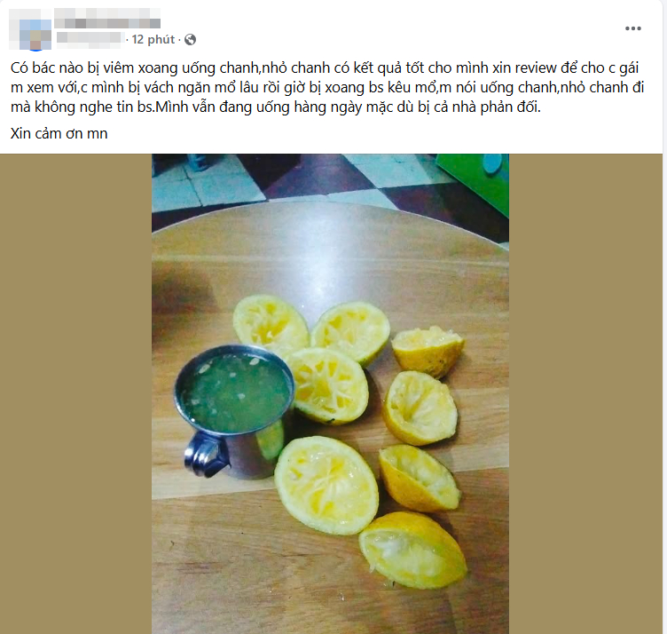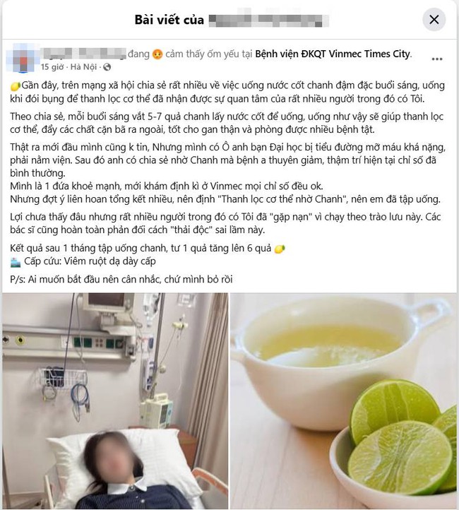 Mới đây, một tài khoản facebook có tên N.T.N đã chia sẻ câu chuyện của chính bản thân mình để cảnh tỉnh cho những ai đang nuôi mộng "uống nước cốt chanh mỗi sáng để thải độc". Theo chia sẻ của cô thì, bản thân vốn là người khỏe mạnh, khám định kỳ đợt vừa rồi cho kết quả các chỉ số bình thường. Nhưng do 1 thời gian liên hoan, tổng kết nhiều nên chị cũng muốn thanh lọc cơ thể. Trong khi trên mạng xã hội chia sẻ nhiều về việc dùng chanh thải độc, lại thấy 1 người quen của mình "truyền kinh nghiệm " là dùng chanh mà giảm bệnh tiểu đường, mỡ máu... nên chị đã tin và làm theo. Kết quả là sau 1 tháng uống chanh, mới đầu là 1 quả, sau tăng lên 6 quả mỗi sáng thì chị đã phải đi cấp cứu vì... viêm ruột, dạ dày cấp.