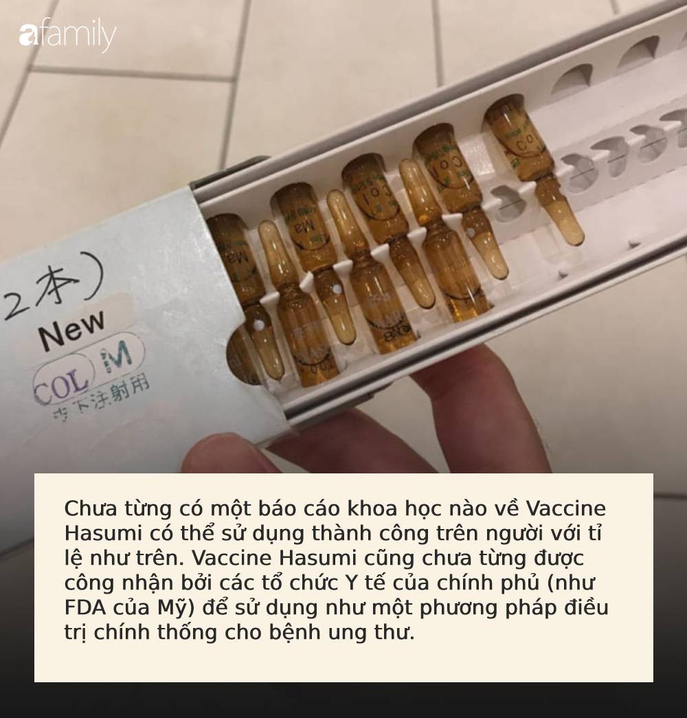 Website của trung tâm nói trên đưa ra thông tin "nghiên cứu và ứng dụng thành công Vaccine Hasumi phòng và điều trị ung thư, đối với ung thư giai đoạn 1,2,3 là hoàn thiện 100%, với ung thư giai đoạn 4 tỷ lệ thành công cao 70% - 80%".