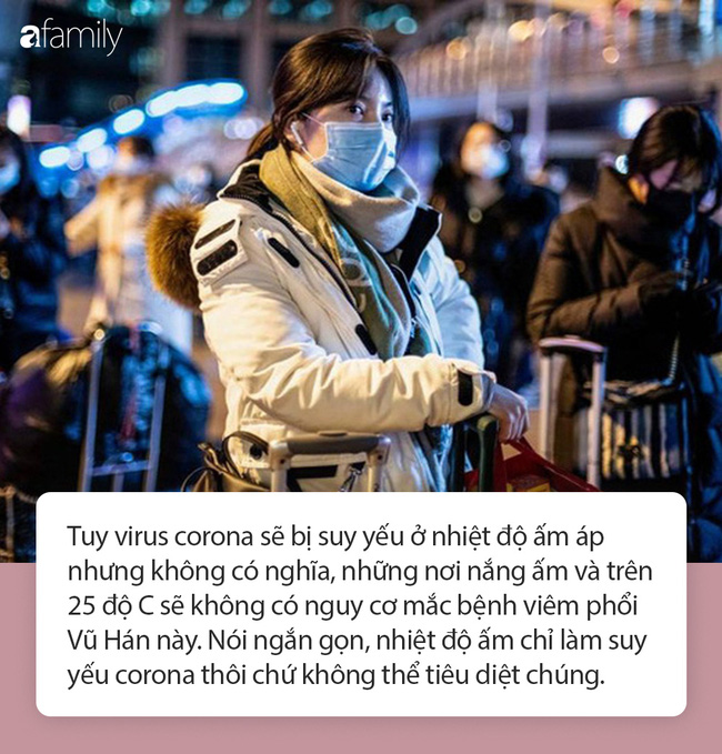 Tuy virus corona sẽ bị suy yếu ở nhiệt độ ấm áp nhưng không có nghĩa, những nơi nắng ấm và trên 25 độ C sẽ không có nguy cơ mắc bệnh viêm phổi Vũ Hán này. Nói ngắn gọn, nhiệt độ ấm chỉ làm suy yếu corona thôi chứ hoàn toàn không có tác dụng tiêu diệt chúng, muốn "khử" hoàn toàn thì ít nhất phải 60 độ trở lên. Nhưng đừng vì vậy mà vội tắt điều hòa nhé, ít nhất làm vậy cũng sẽ giảm thiểu nguy cơ mắc bệnh đấy.