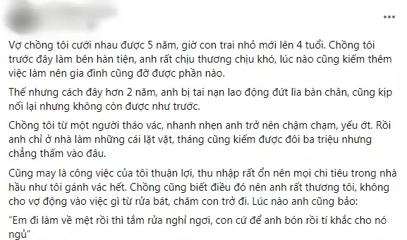 Chồng tôi từ một người tháo vác, nhanh nhẹn anh trở nên chậm chạm, yếu ớt. Rồi anh chỉ ở nhà làm những cái lặt vặt, tháng cũng kiếm được đôi ba triệu nhưng chẳng thấm vào đâu.