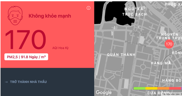 Hôm nay 17.9, thông qua các ứng dụng đo thời tiết như Air Visual, nhiều điểm quan trắc taị Hà Nội có chất lượng không khí AQI chạm mốc 170.