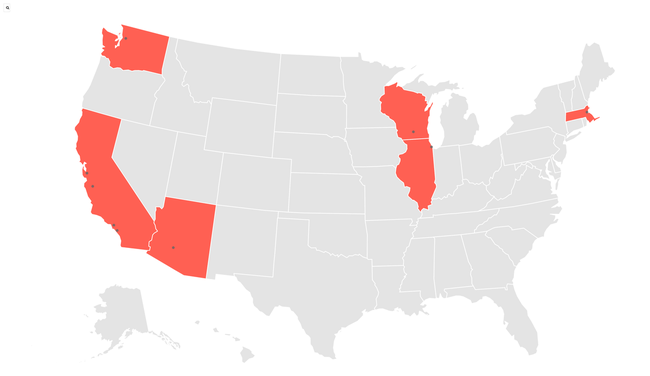 Hoa Kỳ đã ghi nhận 12 trường hợp trên 5 tiểu bang. Trong đó 6 trường hợp ở California, 2 trường hợp Illinois. Riêng ở Arizona, Massachusetts, Washington và Wisconsin thì mỗi nơi có một trường hợp mắc bệnh.
