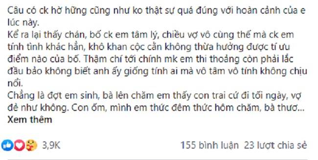 Chẳng là đợt em sinh, bà lên chăm em thấy con trai cứ đi tối ngày, vợ đẻ như không. Con ốm, mình em thức đêm thức hôm chăm, bà thương con dâu, góp ý với con trai. Vậy mà anh gắt gỏng: 'Đàn bà ai chửa đẻ chẳng thế. Có phải mình vợ con sinh nở đâu mà mẹ cứ kêu than vất vả thay con dâu làm gì'.