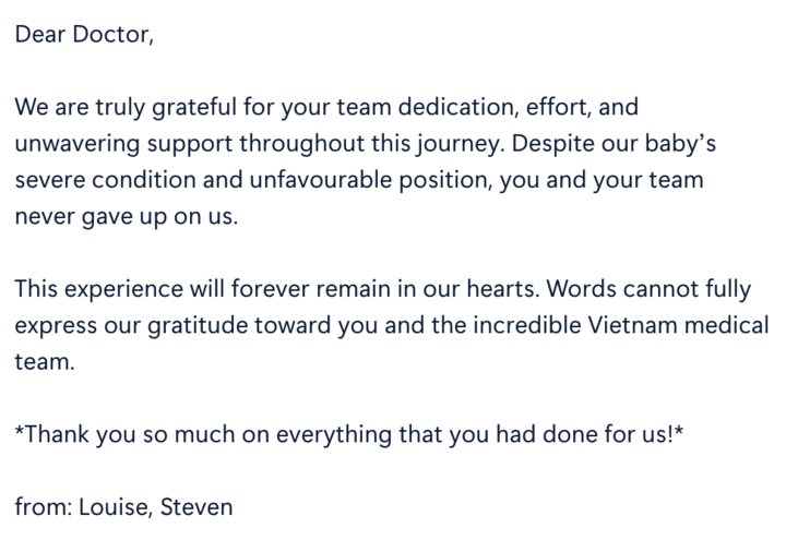 "Trải nghiệm này sẽ mãi mãi ở trong tim chúng tôi. Không lời nào có thể diễn tả hết lòng biết ơn của chúng tôi đối với đội ngũ y tế tuyệt vời của Việt Nam. Cảm ơn các bạn rất nhiều vì mọi việc các bạn đã làm cho chúng tôi," vợ chồng sản phụ người Singapore xúc động chia sẻ trong thư.
