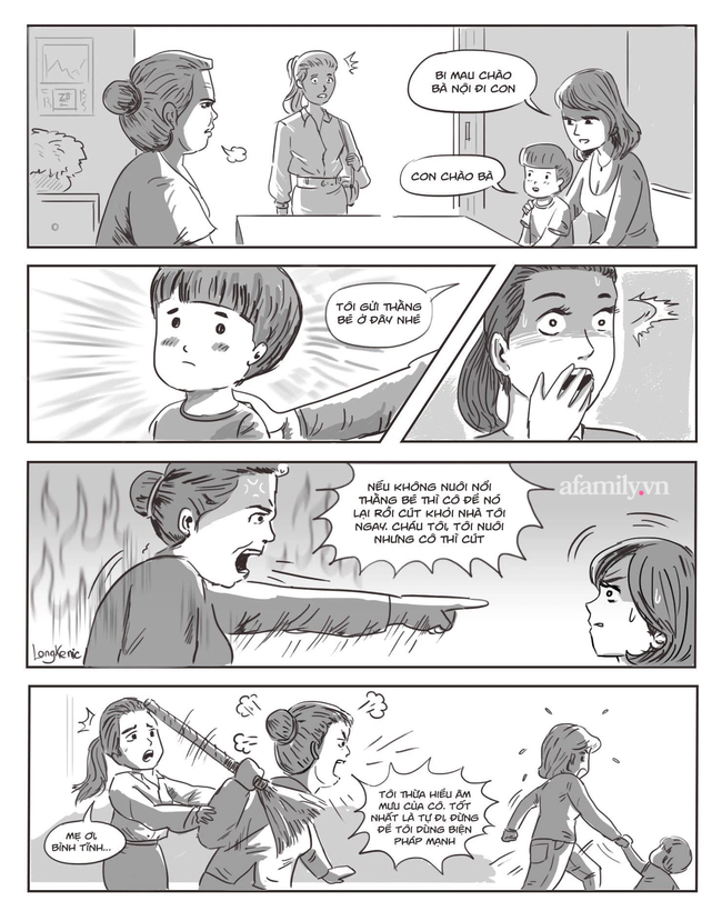 Nhưng tôi còn chưa kịp lên tiếng thì mẹ chồng đã bực bội bảo: "Nếu không nuôi nổi thằng bé thì cô để nó lại rồi cút khỏi nhà tôi ngay. Cháu tôi, tôi nuôi nhưng cô thì cút. Nhà tôi không phải cái chợ để cô muốn đến là đến, muốn đi là đi. Tôi thừa hiểu âm mưu của cô. Tốt nhất là tự đi, đừng để tôi dùng biện pháp mạnh". Mẹ chồng tôi vừa nói vừa đi thẳng xuống bếp, cầm cây chổi lên. Vợ cũ của chồng tôi tái mặt, vội vã dẫn con đi mất.