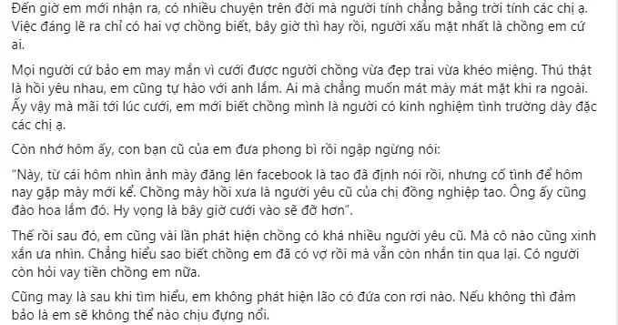 “Này, từ cái hôm nhìn ảnh mày đăng lên facebook là tao đã định nói rồi, nhưng cố tình để hôm nay gặp mày mới kể. Chồng mày hồi xưa là người yêu cũ của chị đồng nghiệp tao. Ông ấy cũng đào hoa lắm đó. Hy vọng là bây giờ cưới vào sẽ đỡ hơn”.