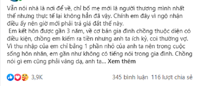 "Vẫn nói nhà là nơi để về, chỉ bố mẹ mới là người thương mình nhất thế nhưng thực tế lại không hẳn đã vậy. Chính em đây vì ngộ nhận điều ấy nên giờ mới phải trả giá đắt thế này.