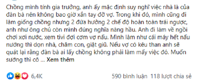 "Chồng mình tính gia trưởng, anh ấy mặc định suy nghĩ việc nhà là của đàn bà nên không bao giờ xắn tay đỡ vợ. Trong khi đó, mình cũng đi làm giống chồng nhưng 2 đứa hưởng 2 chế độ hoàn toàn trái ngược, anh như ông chủ còn mình đúng nghĩa nàng hầu. Anh đi làm về ngồi chơi xơi nước, xem tivi đợi cơm vợ nấu. Mình làm như cái máy hết nấu nướng thì dọn nhà, chăm con, giặt giũ. Nếu vợ có kêu than anh sẽ quát lại rằng đàn bà ai lấy chồng không phải làm mấy việc đó. Muốn sướng thì cô đừng kết hôn làm gì".