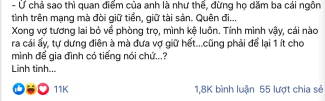‘Ô hay, tưởng thích là được à, tiền không ai giữ hết, có dư thì tiết kiệm, còn lại chi tiêu như nào thì 2 vợ chồng tính toán, đừng có kiểu em giữ hay anh giữ’.