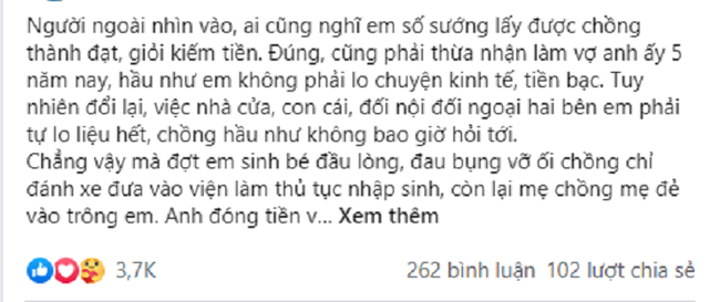 Chẳng vậy mà đợt em sinh bé đầu lòng, đau bụng vỡ ối chồng chỉ đánh xe đưa vào viện làm thủ tục nhập sinh, còn lại mẹ chồng mẹ đẻ vào trông em. Anh đóng tiền viện phí xong là quay ra xe đi công tác liền 10 ngày. Lúc em xuất viện, chồng còn chưa về. Vợ nói thì anh lại bảo: 'Em đúng là được voi đòi tiên. Em thử xem có mấy người được chồng lo cho cuộc sống sung túc, tiêu tiền không phải nghĩ như em'.