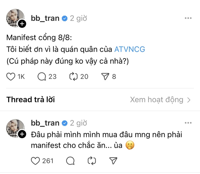 Theo đó, tối 8/8, BB Trần thông báo trên trang cá nhân: "Tôi biết ơn vì là quán quân Anh Trai Vượt Ngàn Chông Gai". Cư dân mạng xôn xao cho rằng anh "trượt tay" lộ kết quả. Thế nhưng, trước câu nói này, nam diễn viên đã dùng cụm "Manifest" - nghĩa là suy nghĩ, tưởng tượng cho tới khi điều mình muốn thành hiện thực, có thể như một kiểu truyền thông điệp tích cực vào vũ trụ. BB Trần còn cho rằng phải mượn dịp ngày đẹp để đăng đàn "cầu nguyện" như thế vì "đâu phải mình mình mua đâu nên phải manifest cho chắc ăn".