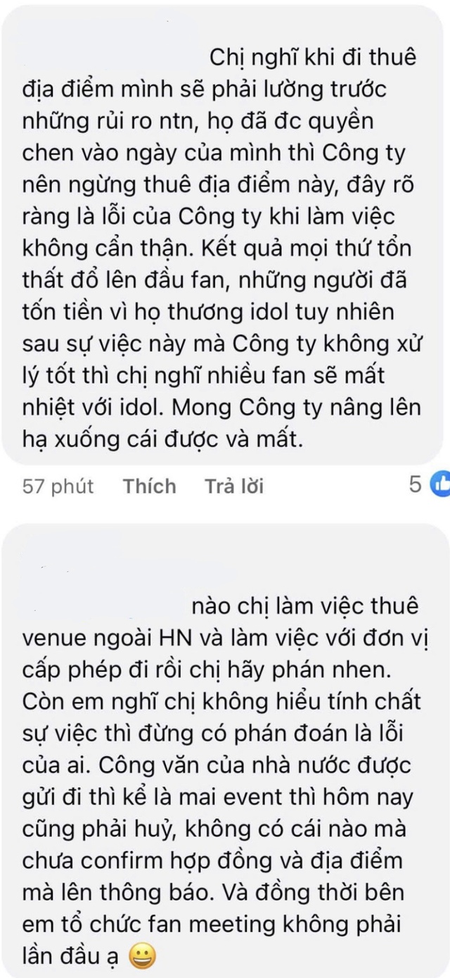 Khi 1 bạn fan khuyên công ty G nên tìm hướng phải quyết hợp tình hợp lý nhất để tránh gây mất cảm tình, khiến sức nhiệt idol bị giảm, người đại diện này đã đã có phát ngôn trách ngược lại fan: “Nào chị làm việc thuê venue ngoài Hà Nội và làm việc với đơn vị cấp phép đi rồi chị hãy phán nhen. Còn em nghĩ chị không hiểu tính chất sự việc thì đừng có phán đoán là lỗi của ai. Công văn của Nhà nước được gửi đi thì kể là mai event thì hôm nay cũng phải huỷ, không có cái nào mà chưa confirm hợp đồng và địa điểm mà lên thông báo. Và đồng thời bên em tổ chức fan meeting không phải lần đầu ạ”.